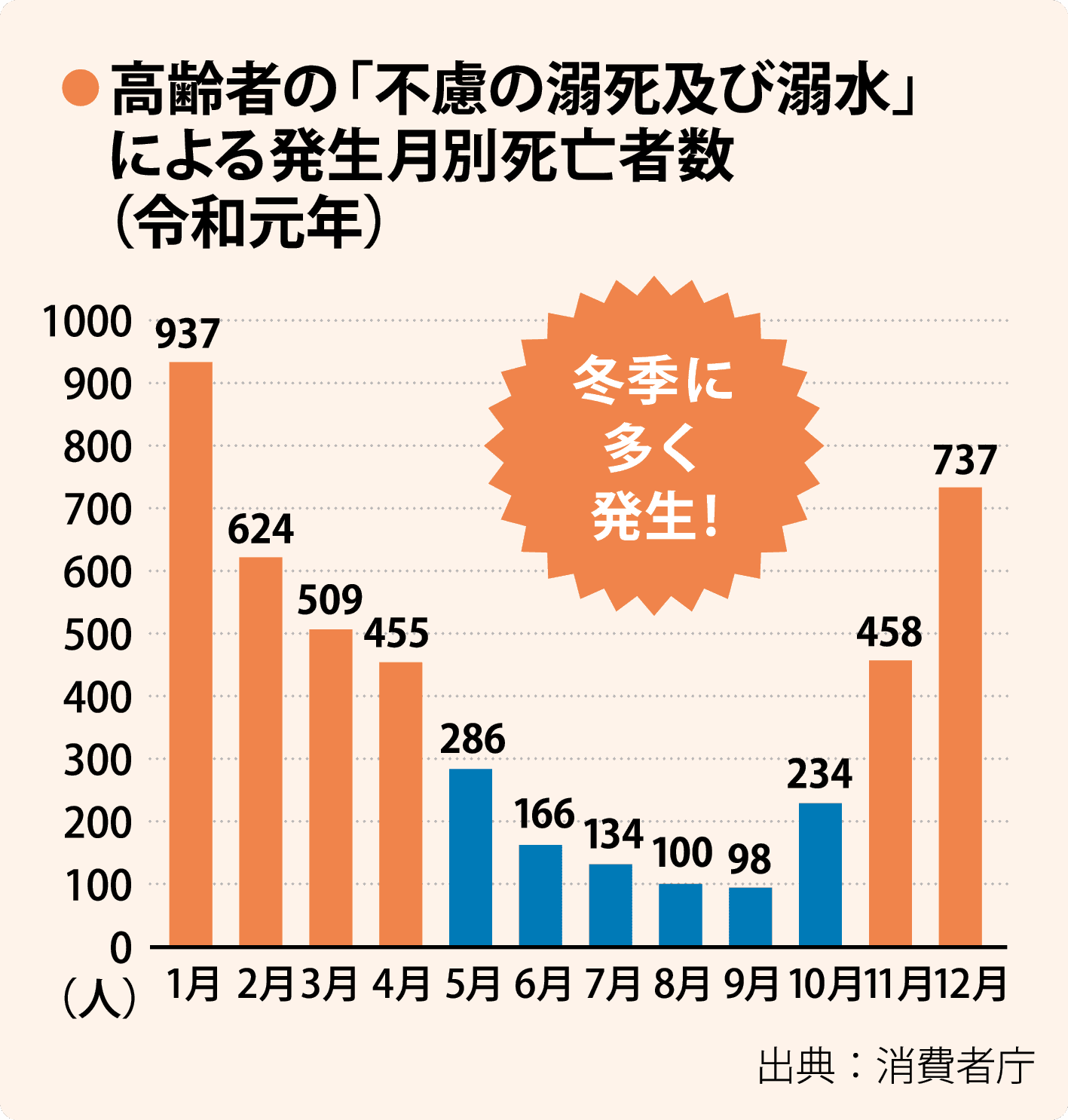 溺死を含む入浴中の事故死は、特定の季節や時間帯に集中する傾向があり、特に冬季(12月~2月)には、年間発生件数の約半数が集中します。これは、暖かい部屋から寒い脱衣所への移動によって血圧が急変する、いわゆる「ヒートショック」が主な引き金となっていることを示しています。