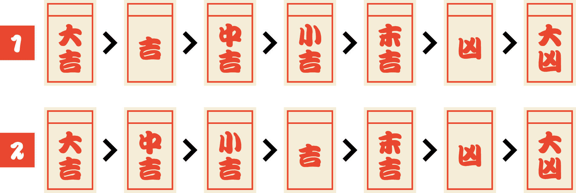 気になるおみくじの順番ですが、公式な見解はありません。一般的には七段階に分かれていて2つの考え方があり、神社やお寺によって異なるため直接聞いてみてもいいでしょう。